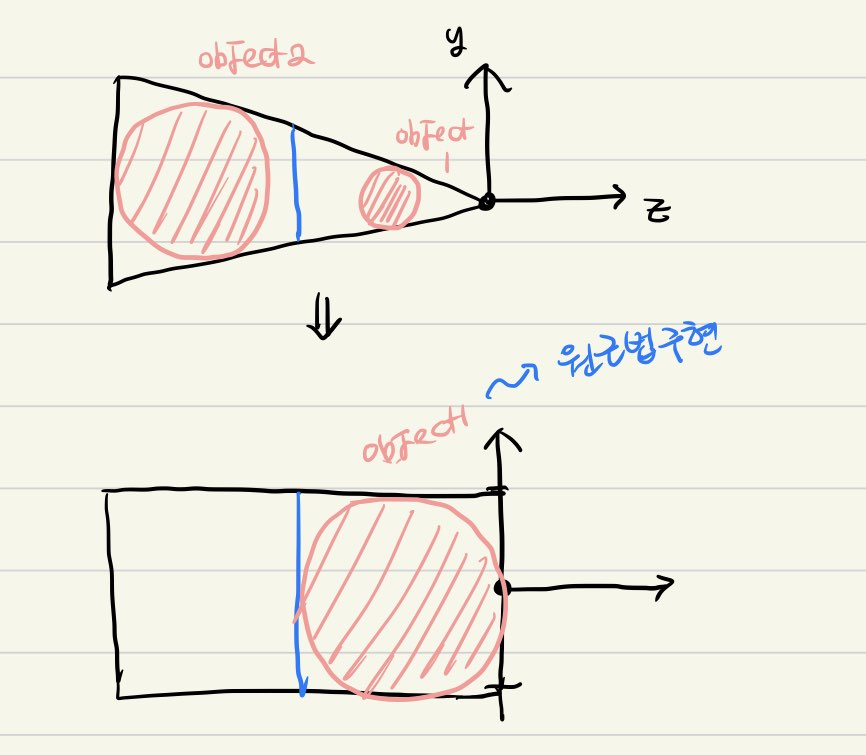 이거는 조금 어렵다. 하지만 이해하면 쉽다. 원근법을 근사한 변환이라고 생각하면 된다. 우리는 3D space에 그렸지만, 화면은 평면이므로 2D에서 최대한 3D스럽게 표현하려면 원근법이 필요하다.