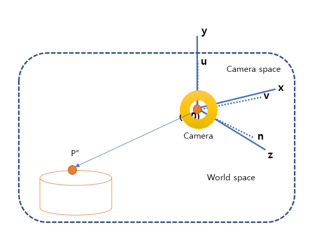 카메라 space는 (u,v,n)총 3개의 축으로 이루어지는데 n의 경우 카메라 시점에서 카메라가 바라보는 시점까지의 벡터의 반대방향으로 정의되고, u는 카메라 시점 위 벡터인 up벡터와 n의 외적으로 구한다. v는 n과 u의 외적으로 구한다.