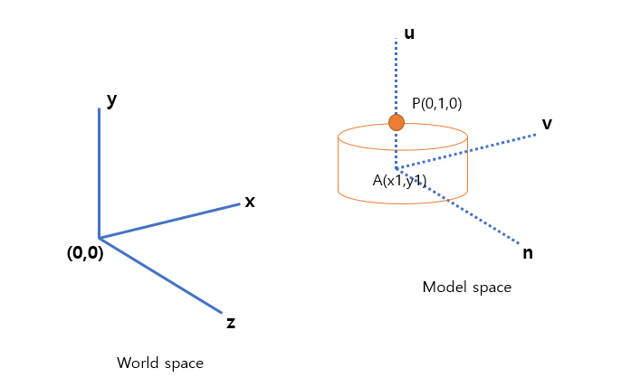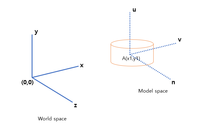 world space에서 봤을 때 model space의 원점의 좌표는 (x1,y1)이라고 가정한다면, 모델 공간에서 그려진 원통을 가져오려면 그만큼 이동이 필요할것이다. 때에따라서 회전이나, 축소확대도 필요하다.