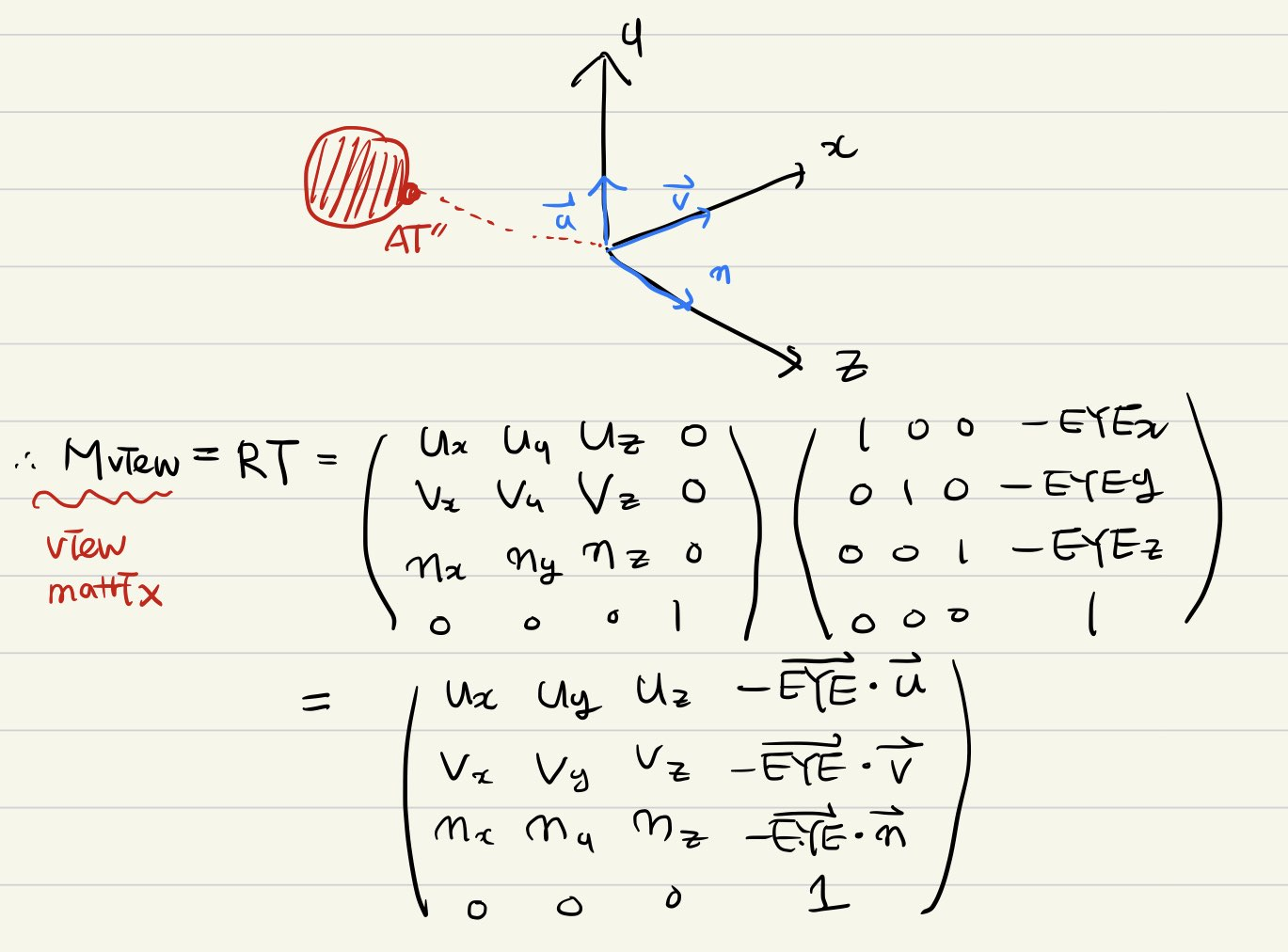 도대체 왜 이런짓을 하냐 싶겠지만, 이게 제일 편한 방법이다. 수학을 좀 다뤄본 사람은 알겠지만 뭐든 원점으로 갖다놓으면 편하다. 일단 원점을 포개어놓는 변환은 앞서 다룬 translate과 똑같다. 그리고 지금 그림에서는 축이 거의 일치하지만, 카메라가 다양한 각도에서 보는게 가능하므로 각 카메라의 (u,v,n)기저를 x,y,z처럼 회전이 필요하다.