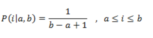 uniform discrete distribution, 아래와 같이 범위내 정수가 모두 같은 확률 P로 범위 내의 정수 a,b가 나타나는 난수 생성 함수